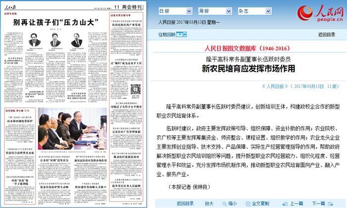 平博·Pinnacle官方网站高科常务副董事长伍跃时委员建议,创新培训主体,构建政校企合作的新型职业农民培育体系。